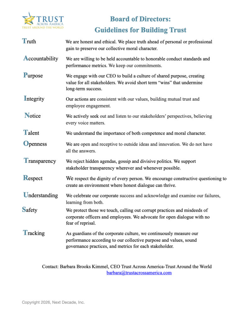 For more information contact Barbara Brooks Kimmel, Founder, Trust Across America-Trust Around the World